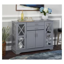 Update your living space with the Kendall Buffet from Buylateral. Ideal for your dining room, this cabinet features unique panel tempered glass doors with an x-shaped overlay and adjustable tempered glass shelving. The concealed closed center cabinet and two drawers provide added space for storing tableware, linens and more. Designed with a gray finish and a transitional style, this cabinet is the perfect complement with most dining room décor.