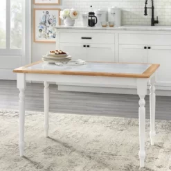 The Tara Tile Top Dining Table from Buylateral has a charming country style that can seat up to four people. This dining table is made of rubberwood and features a white ceramic tile-top with a natural wood border and white turned legs. This beautiful table will work great for all of your everyday gatherings with your family and friends.